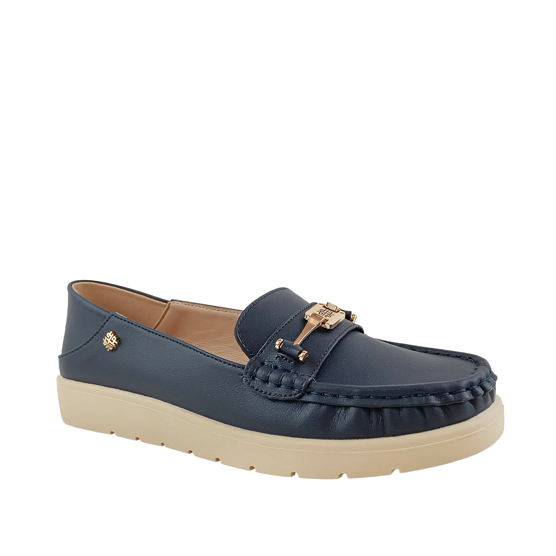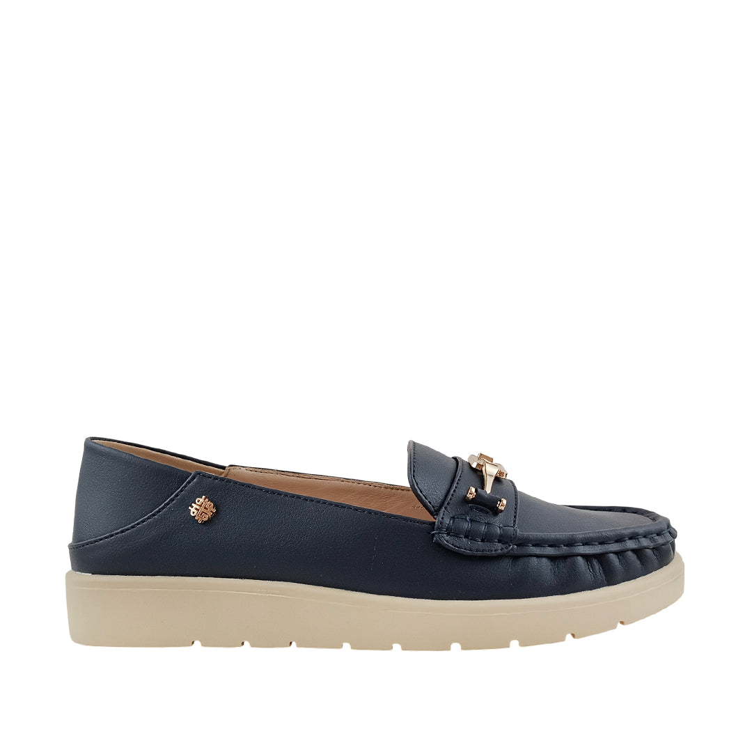 Mocasines Andrea para mujer en color navy, elaborados en cuero. Incorporan tecnología Bounce™ con plantilla extraíble que brinda comodidad, rebote de energía en cada paso y gran durabilidad para acompañarte todo el día.