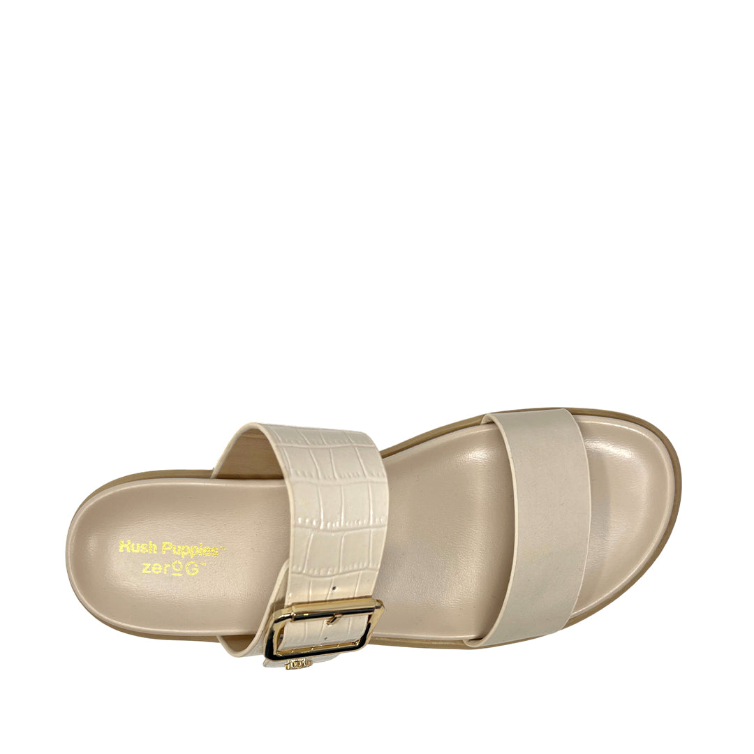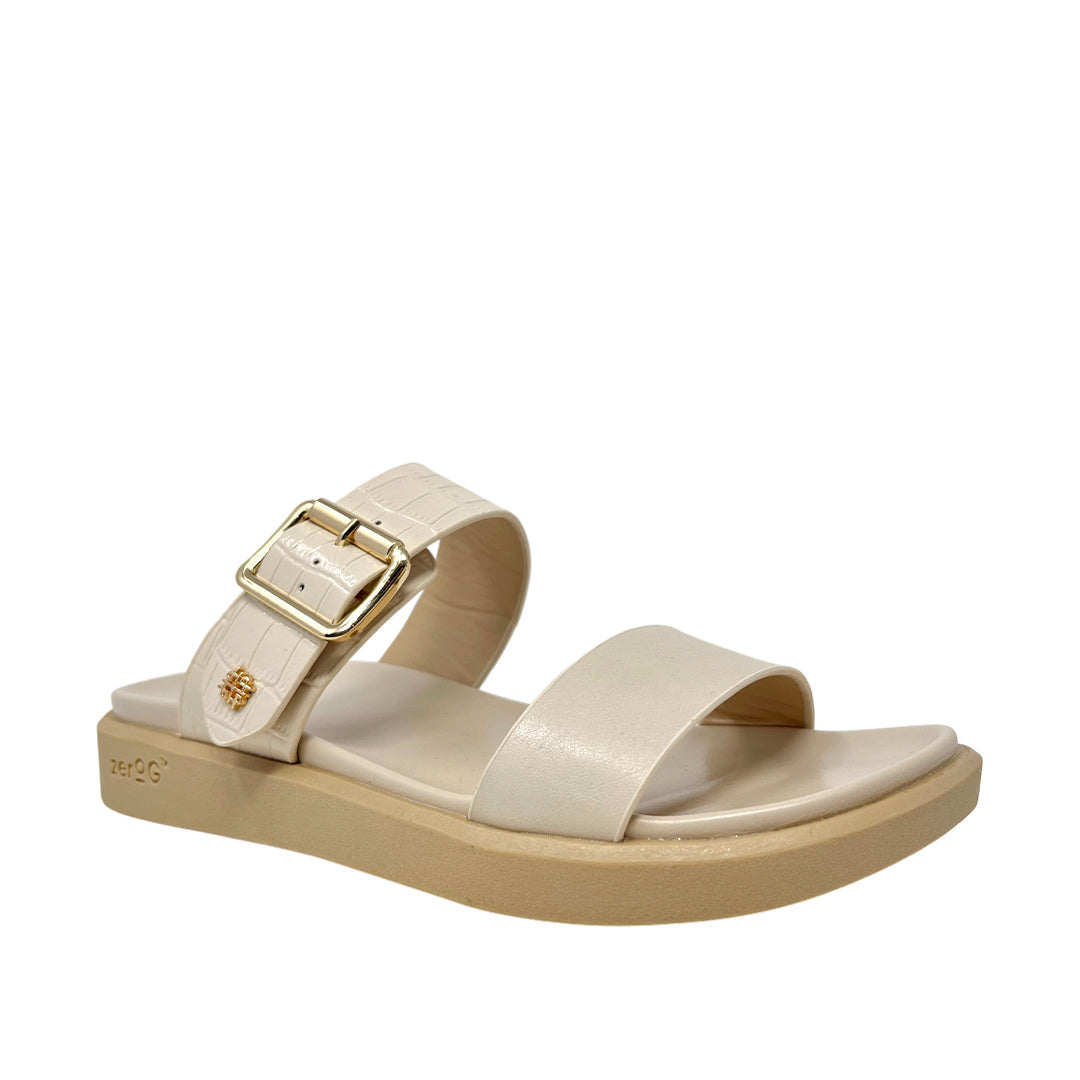 Sandalias flats Valia para mujer color beige, en cuero con Zero G. Suelas ligeras y flexibles, forros suaves y plantilla de látex de alta memoria.